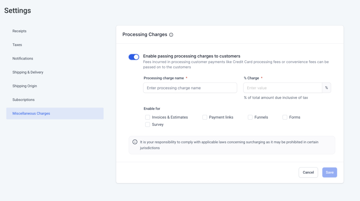 Our latest feature allows you to pass processing charges or additional fees directly to your customers. This update simplifies billing by letting you incorporate these costs into your pricing structure, ensuring transparency and ease.